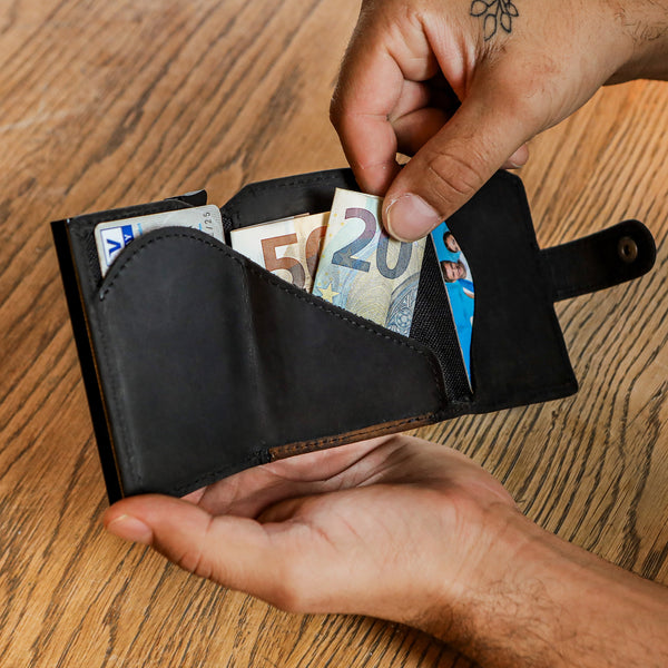 Das ist ganz einfach: Wir fertigen unsere Geldbeutel ausschließlich per Hand aus echtem vollnarbigen Büffelleder, welches als das robusteste Leder der Welt gilt. Zusätzlich versiegeln wir durch die besondere Schleiftechnik die Oberfläche der Geldbeutel. Während der Verwendung unserer Geldbeutel entsteht dadurch eine lebendige Patina die den individuellen Charakter dieses ausdrucksstarken Leders unterstreicht.