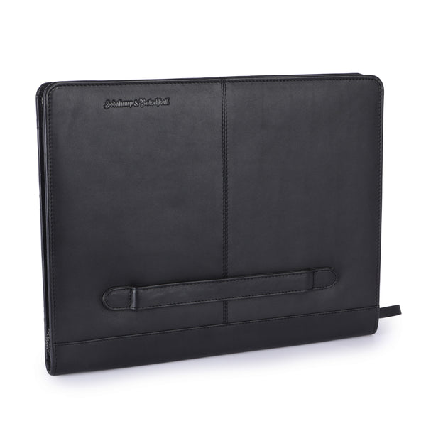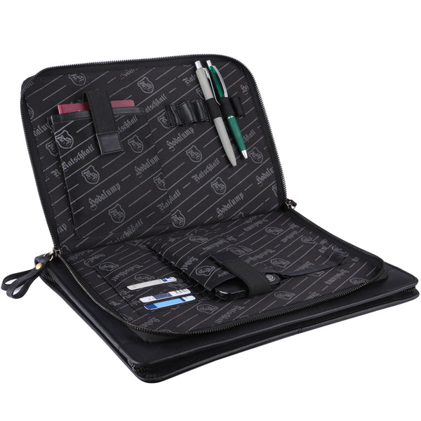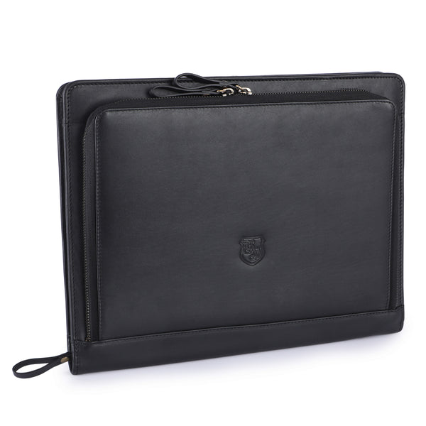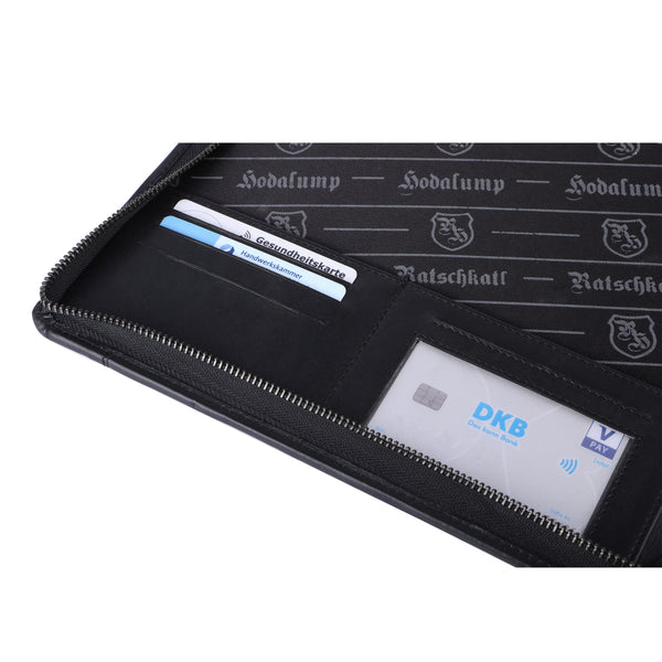 Inside, the folder offers space for A4 documents, a notepad, a tablet, and business cards. Integrated compartments keep all your important documents neatly organized and ready to hand. A wraparound zipper ensures secure closure, while the sturdy leather exterior protects everything you store inside.