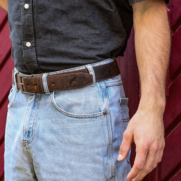 This handcrafted belt made of oiled buffalo leather impresses with its rugged appearance and discreet hidden pocket. Perfect for men who value quality, style, and functionality.