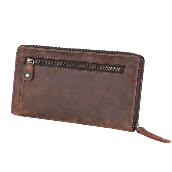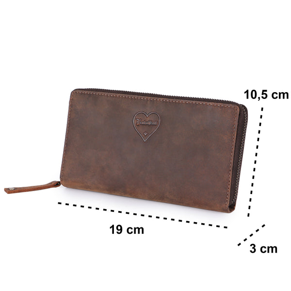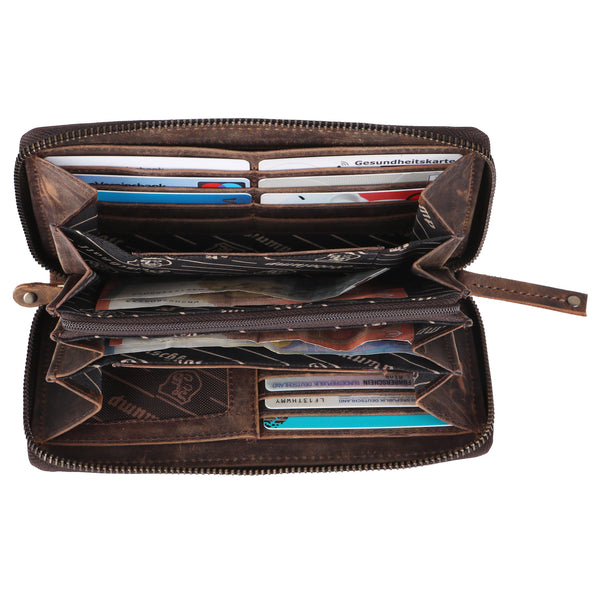 The Gretl features a well-thought-out interior layout with multiple card slots, a large bill compartment, and a secure zippered coin pocket. The separate cell phone compartment is particularly practical, providing a secure place for your smartphone without it floating around elsewhere in the bag. The high-quality genuine leather ensures that the wallet not only looks great but also develops a beautiful patina over time.