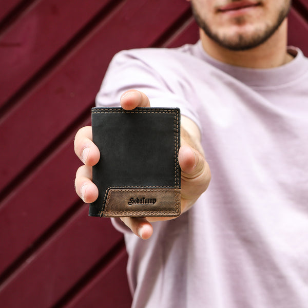 It's quite simple: We craft our wallets exclusively by hand from genuine full-grain buffalo leather, considered the most robust leather in the world. We also seal the surface of the wallets using a special sanding technique. As our wallets are used, this creates a vibrant patina that underscores the individual character of this expressive leather.