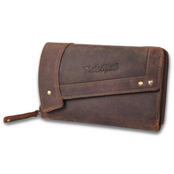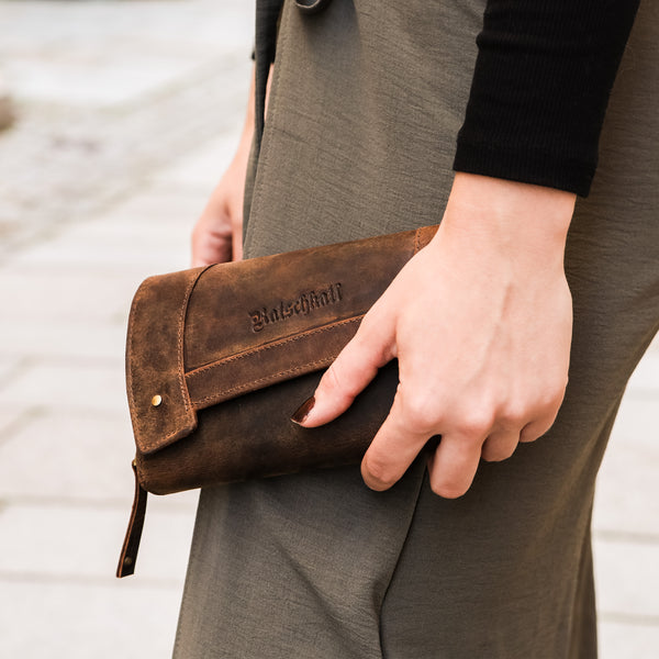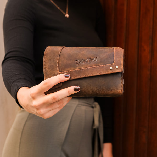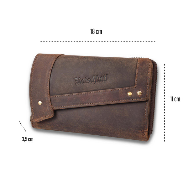 Zenta offers plenty of space inside: numerous card slots, two large bill compartments, a zippered pocket for coins, and a window for ID or a photo. The wraparound zipper ensures security, while the soft leather develops a unique patina over time. The exterior is adorned with subtle Ratschkatl lettering – a loving detail with personality.