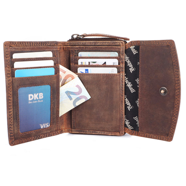 The sophisticated design ensures that everything stays safe and organized. Inside, you'll find space for cards, a compartment for bills, and a coin pocket that closes with a practical snap fastener. The robust genuine leather feels comfortable and develops a unique patina over time, giving the Hilde Small Wallet even more character.