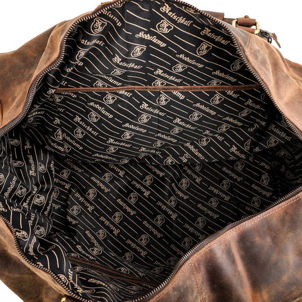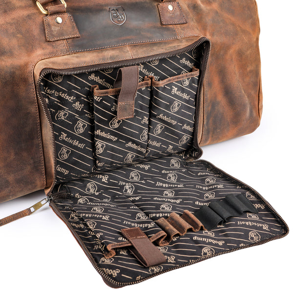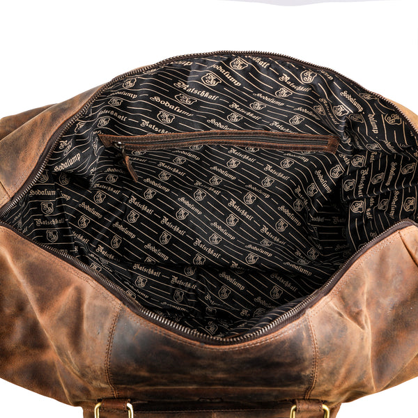 The Large Buffalo Leather Travel Bag is your reliable companion for weekend trips, short breaks, or spontaneous adventures. Crafted from genuine, high-quality buffalo leather, it combines maximum functionality with striking vintage charm. Whether in the car, on the train, or on the baggage carousel – this bag will turn heads while safely storing everything you need.