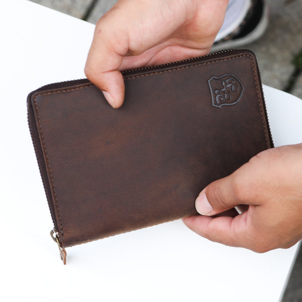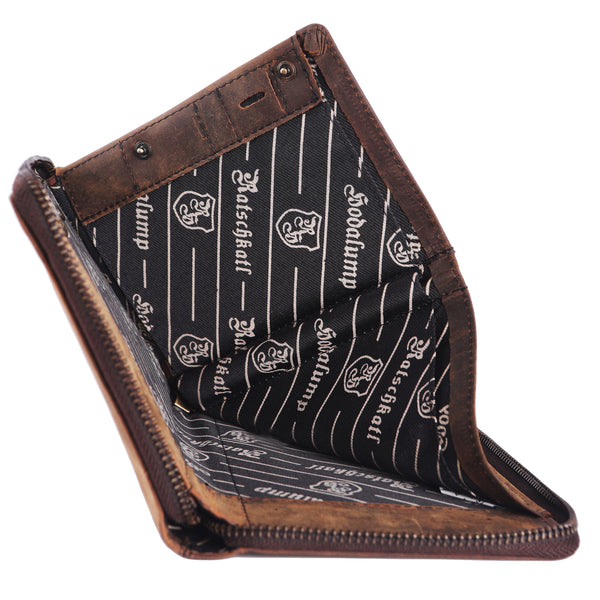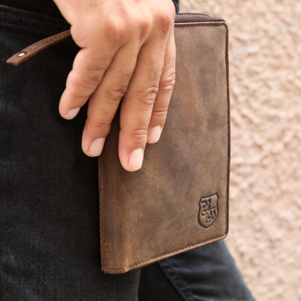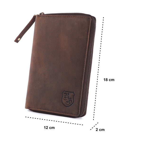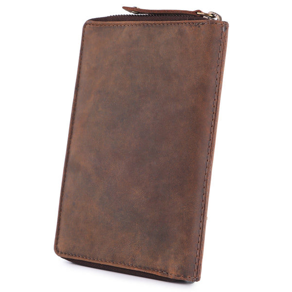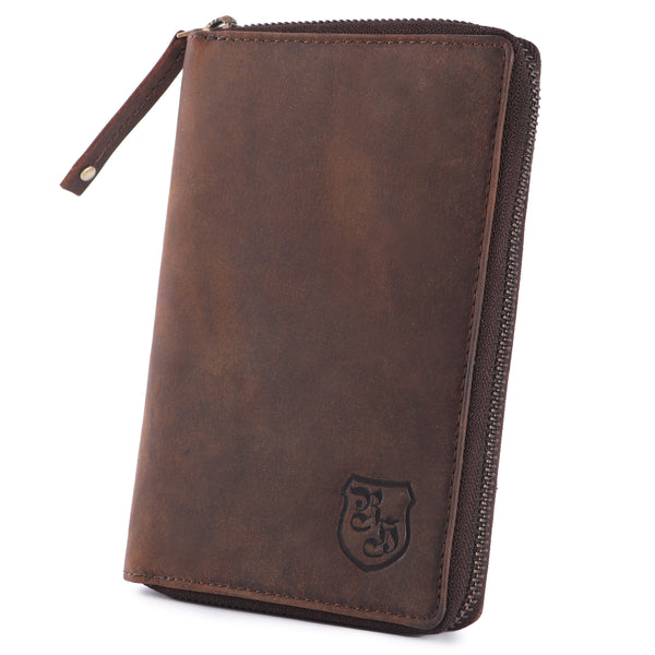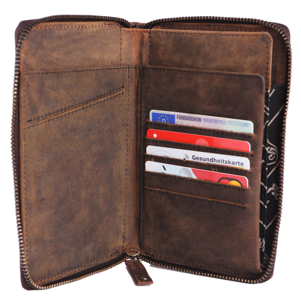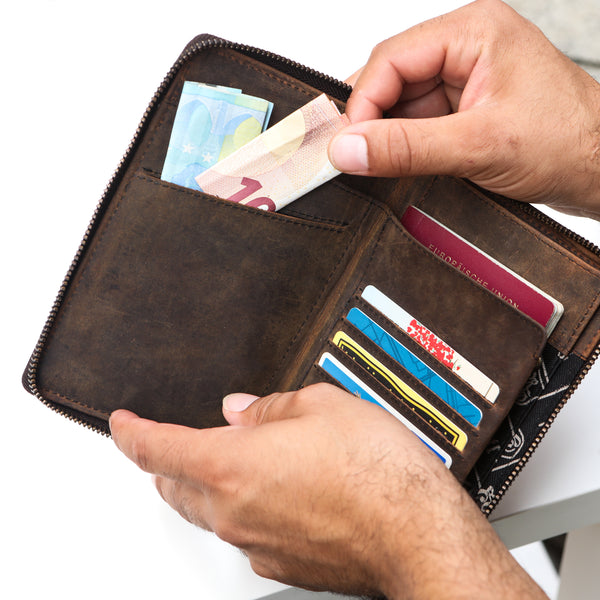 Crafted from high-quality genuine leather, this travel wallet not only looks great but is also durable. Inside, you'll find thoughtful organization: multiple card slots, a large passport pocket, a zippered coin pocket, and a separate cell phone pocket. Thanks to the wraparound zipper, everything stays securely in place – even with a lot of movement.