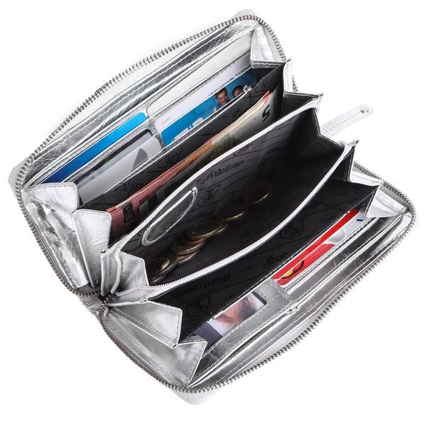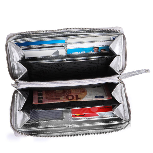The Classic Gretl wallet in silver is the perfect combination of elegance and functionality. Crafted from high-quality genuine leather and equipped with a practical cell phone compartment, this wallet offers space for everything you need in everyday life – and more. Its timeless design makes it an essential accessory for the modern woman.